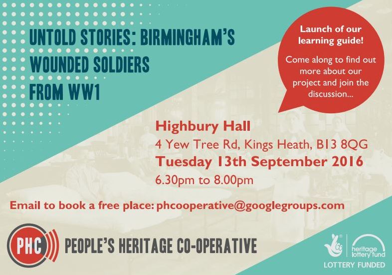 Untold stories – Birmingham’s wounded soldiers from WW1 learning resource to be launched this Tuesday, 13th September 6:30pm at Highbury Hall, one of more than military hospitals, local schools used as hospitals and auxiliary hospitals used in Birmingham during world war one.