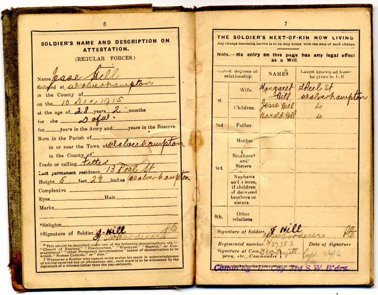 Jesse Hill, a married man with two children from Peel Street in Wolverhampton, enlisted in the British Army in December 1915 and joined the 2ndBattalion South Wales Borderers regiment as a Private. The first time I explored this archive I was taken by Jesse’s ‘Soldiers’ Small Book’, issued to new recruits with information on how to prepare food and how to keep your feet dry, as well as instructions on how to greet soldiers of different rank and how to make complaints, invaluable for any new recruit with no prior experience of military life. The book told me Jesse’s age, height and the names of this two children, Jesse and Harold, but something else about the book struck me – a hole that rips through every page, with a clear entry and exit mark.